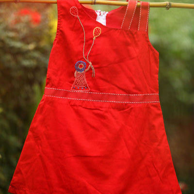 This bright red dress features a little girl playing with balloons. The sleeveless dress has double straps on one of the shoulders making it a perfect choice for a fun outing.